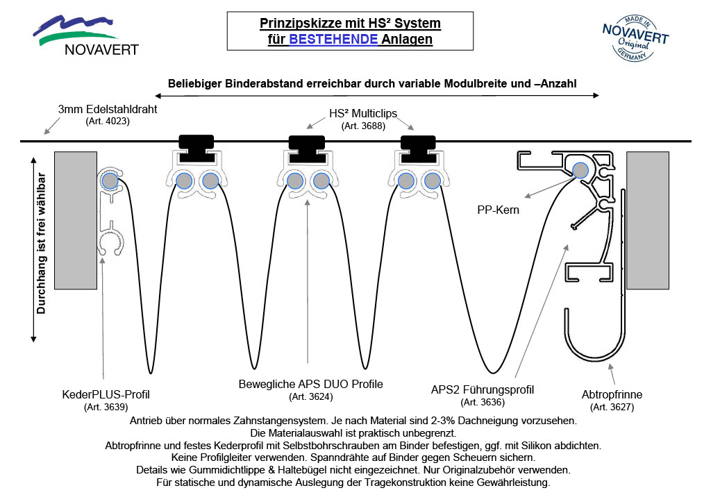 - Wartung: Eine HS2-Anlage sollte regelmäßig an den bekannten Stellen des Antriebssystems (Zahnstangenritzel etc) gefettet und Antriebsseile überprüft werden. Plötzlich auftretenden Geräuschen beim Fahren ist sofort Beachtung zu schenken. Die Profile und Gleiter sind wartungsfrei. Wartungen durch die bekannten Fachfirmen sichern den langfristigen Werterhalt Ihrer Investition.